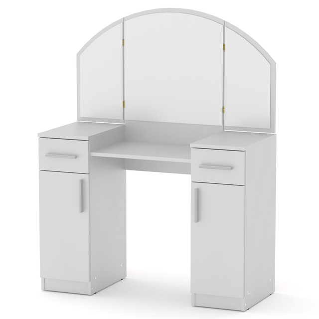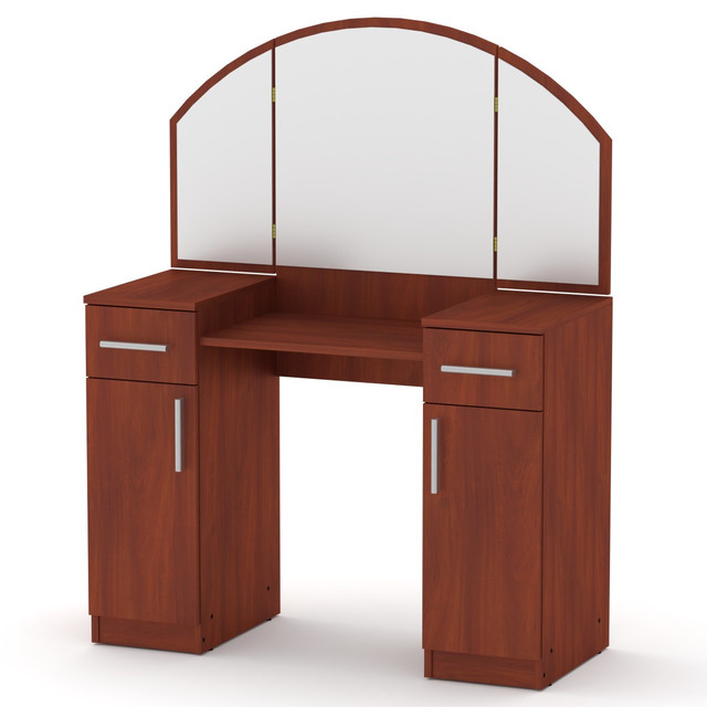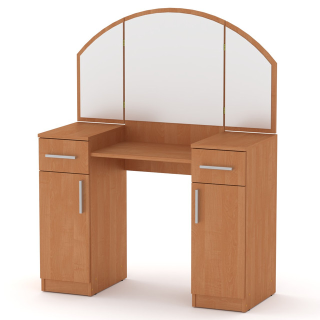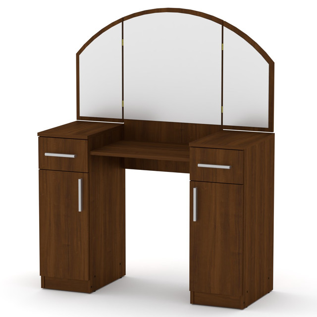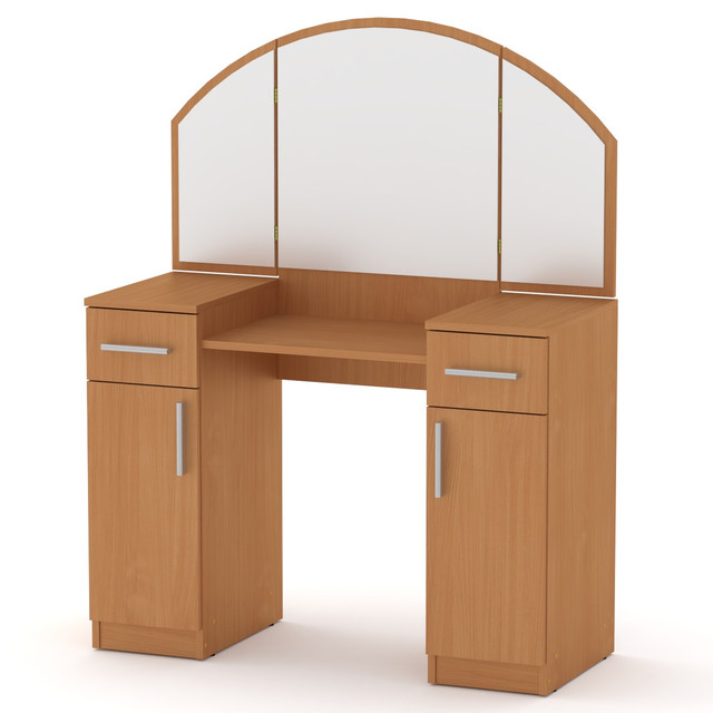 Трюмо-4 фабрики меблів Компаніт — це велика та містка модель, з дзеркалом, розділеним на три частини. У трюмо-4 передбачені дві тумби з боків, у кожної з них є по одному шухляді та відділенню з дверцятами. Випускається трюмо в семи різних варіантах. Водночас що шість кольорів однотонні, а сьомий варіант йде в комбінації двох кольорів — венге темний/венге світлий.